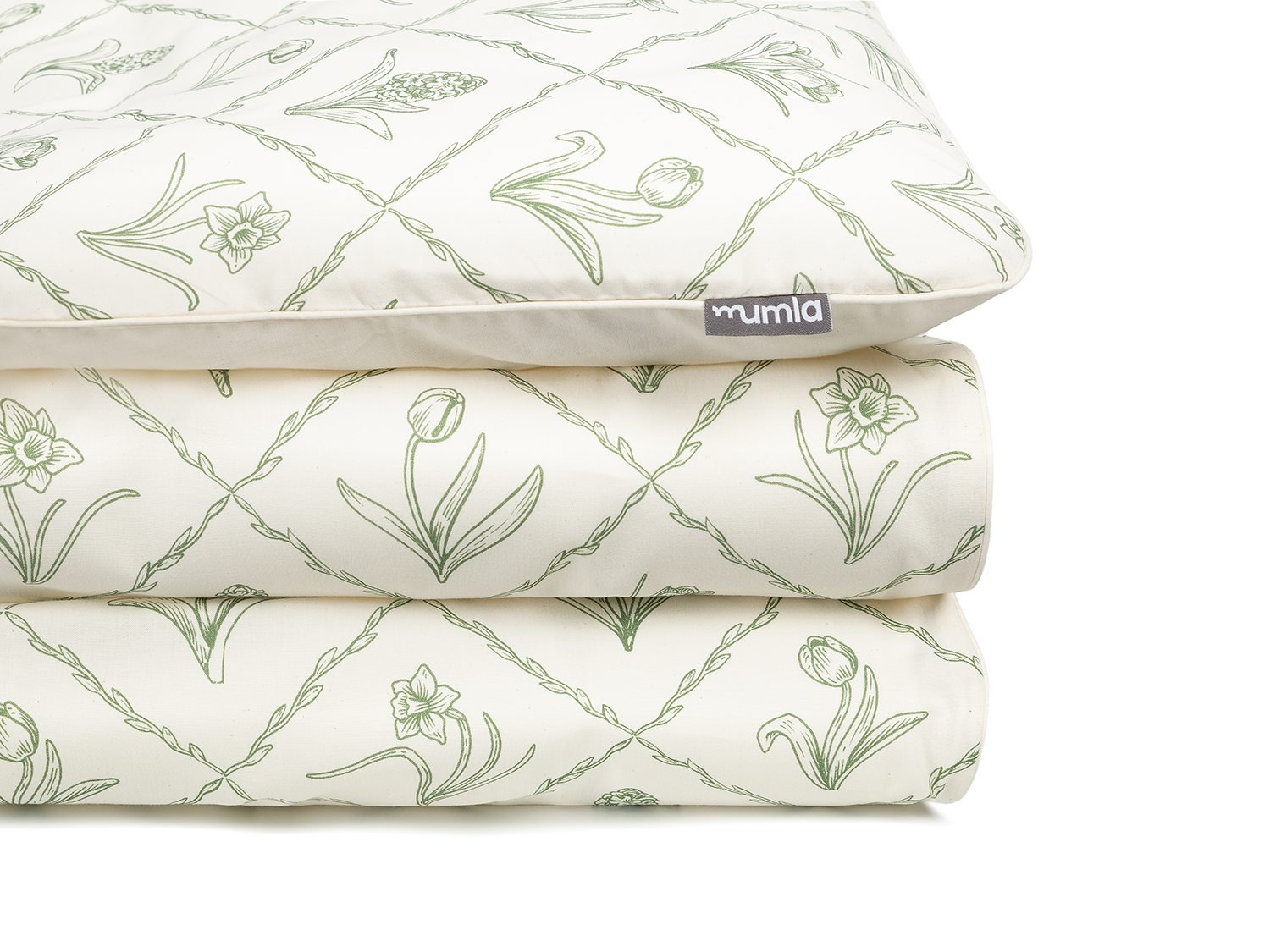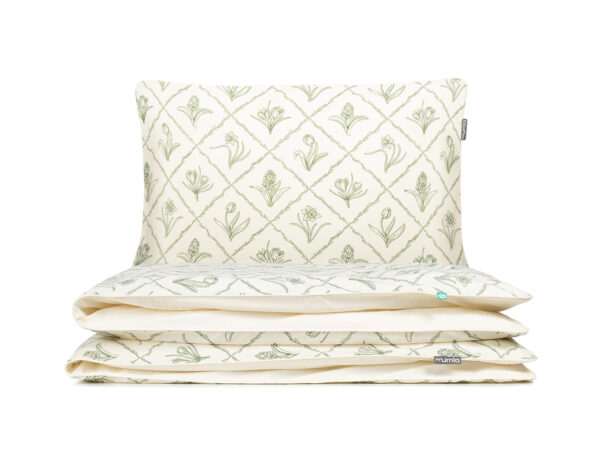 Bettwäsche, die das Motiv von Frühlingsblumen mit einem subtilen, dekorativen Karomuster verbindet. Zarte, skizzierte Pflanzen im geometrischen Rhythmus des Musters schaffen eine harmonische und frische Komposition. Ungebleichter Stoff mit sichtbaren Baumwollschuppen betont den natürlichen Charakter des Materials und verleiht dem Ganzen authentischen Charme.